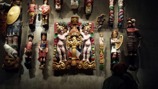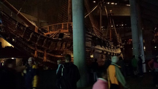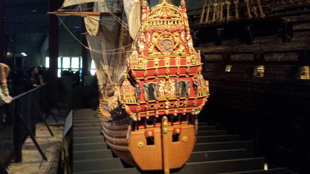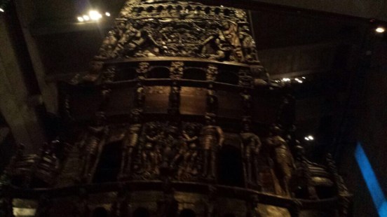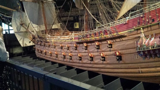 Wenn man in 30 m Höhe über dem Heck nach vorne auf den 70 m entfernten Bugspriet schaut, ist die Wasa schon sehr eindrucksvoll. Im Museum ist es dunkel, daher erst einmal das Modell: